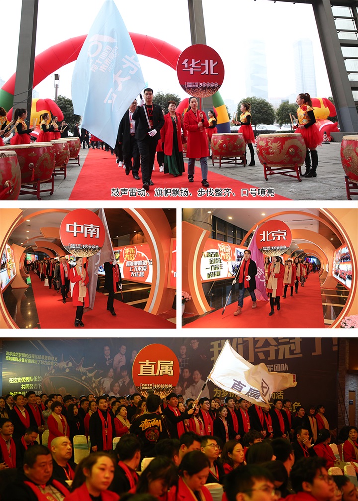 早上七点整,伴随着振奋人心的战鼓声,来自集团九大区的硒鼓科技将士高举旗帜,雄赳赳、气昂昂地踏入会场。